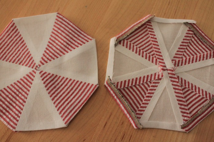 Initially I made a template for the trianges out of cartboard, but soon realized I would not be able to really use it. Even though it was pretty tough cardboard, it was not easy to hold, and it was still easy to cut into with the rotary cutter. So I thought of something else. I had one of those half square triangle templates (plastic) and so I used the 45 degree angle to cut these. I also used the cardboard template under the triangle template to make sure I got the height of the triangle right… This is hard to explain with words only, so I’ll get back to you when I get some pictures. Anyway… I cut enough triangles for 8 “umbrellas” for my quilt design, but then I realized I might want to do something smaller first, just to see how it goes, especially I decided to use linen as the “background” and I have really never used linen in a project like this before. So, instead of a quilt, there will be a pillow: