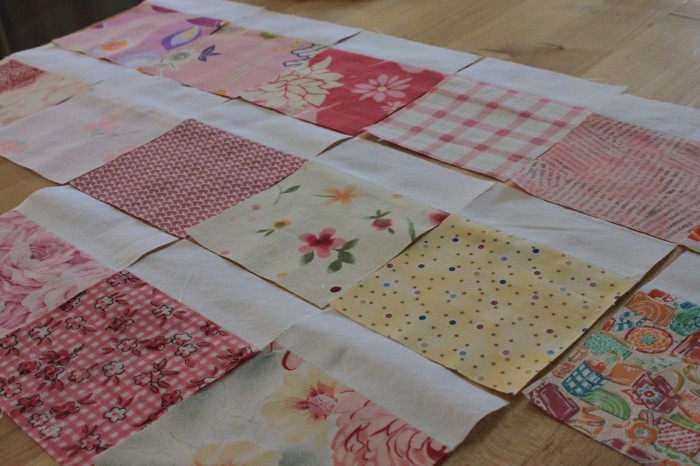 For this project I cut out many, many squares. About 50 3.5 x 3.5 in, about 50 1.5 x 1.5 in and a lot of1.5 in wide strips of white cotton (I used an old white sheet). I started with one pink fabric with a Japanese design, and picked other pink/yellow fabrics from there (I realized I had quite a stash of pink fabrics). Cutting was actually not too bad – this was the first time I cut so many squares at one time. It was actually relaxing. When it was time to start assembling the squares, I got a little bit intimidated with the size (it was supposed to be a larger baby quilt, that’s all), so I decided, again, to scale down the project (“to see how it goes”) and do a doll or a mini quilt. (some commitment issues?) I chose 15 large and 15 small squares and a lot of strips and this is what I had yesterday evening: