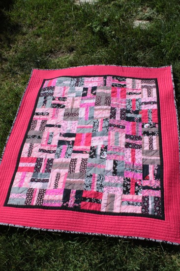 I wanted it to be thick but light and I had some pink fleece lying around so I used that for batting. As for the quilting – I quilted diagonally thrugh each square, and then around the border. Pretty uneventfull.