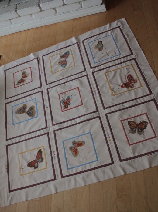 Recently I have been… I am reluctant to say this… yes… “a bit” hooked on thrifting… vintage sheets to be more precise. A few weeks ago I found a flat sheet and a pillowcase with this beautiful butterflies, designed by Hanae Mori. I was distracted by other projects for a while, but then I just grabbed the sheet and started cutting the butterflies (unfortunately, it’s a border print, so there is only about 20 butterflies there; the good thing is that the rest of the sheet was more than enough for all the sashing – it was actually refreshing to work with fabric and not have to calculate every piece, not having to worry about miscutting, being able to rip strips…):