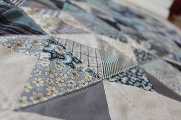 I thought about free motion quilting but I was a little worried about some problematic areas of the top. The linen I used was a little stretchy. This resulted in some wonkiness in a few places. So I decided about straight lines, diagonally on both sides of the seam. I trimmed the quilt, based it and hoped for the best. The stretchiness of the linen actually helped while quilting – I could pull a little to get the straight line and avoid bunching. Satisfied.