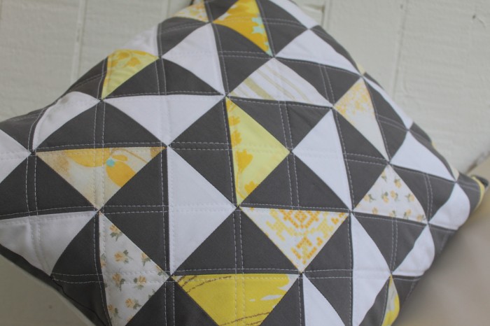 My original idea was to use black, white and yellow, but when I put the fabrics together, given that the yellows were not too bright, I decided that black was just too dark. Each square is made up of one gray triangle and one either white or yellow. The gray fabric is from my stash, the yellow and white are upcycled from vintage sheets. I used the half square triangle method to construct the squares.
