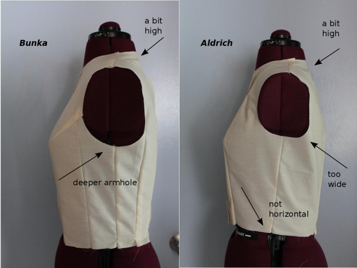4. I’ve just found these entries and wanted to thank you for the comparisonsâ?¦ I have both books as well. I was thinking of doing something similar and comparing yet another draft I have and overlaying them on top of each other. One thing to consider, in terms of fit, is that the dress form’s shoulder rotation and general shape of ‘armhole’ is almost symmetrical (at least my dress form is) front to back–so while it looks good on the form, it might not on a body. Our shoulders are not so symmetrically oval. I wonder how the Aldrich would fit on an actual bodyâ?¦ I kind of like her armhole shape a little better. It’s almost like the two are completely opposed–the back of the Bunka being more scooped out and the front of the Aldrich being more scooped.