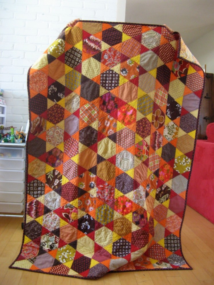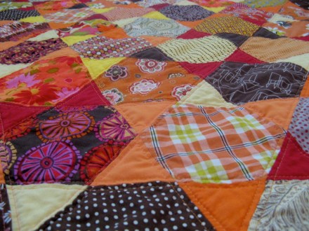 But I like how it turned out. The colors are mostly orange, red and brown, but they are bright enough not to make the quilt boring. I stayed away from any blues, even green-blue – which was another challenge since I was working from my stash, didn’t want to buy anything new, and wanted to have many different fabrics. I ended up using 40-someeting different prints.