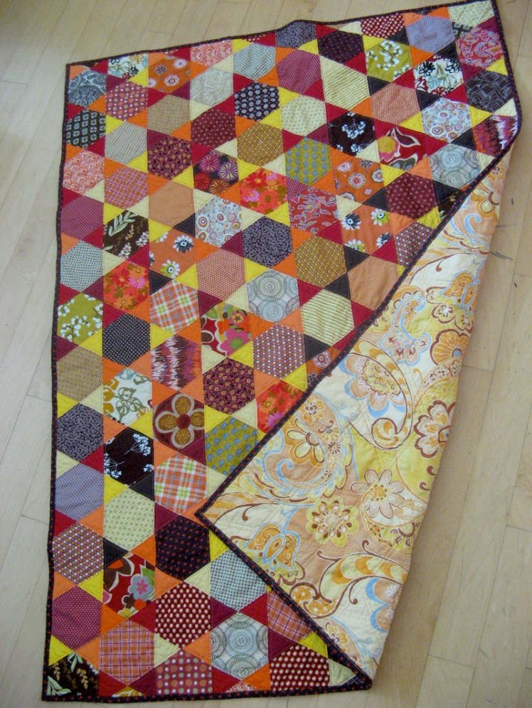 I have many quilts in my head, some in my sketchbook. This one was not one of those. This one went from idea to finished quilt with only a few distractions, even with a few quilts waiting in line to be finished. It is not an original design (in symmetry it is known as Trihexagonal Tiling), but what drew me to it, was a challenge – of figuring out how to cut and piece it without too much trouble.