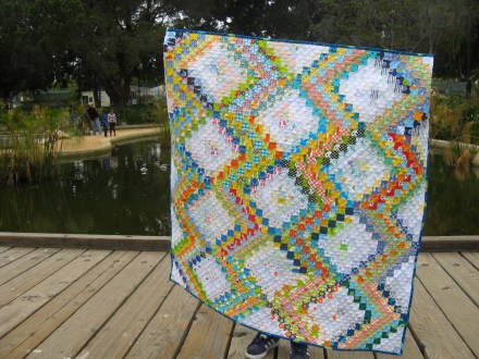 The back… I remembered this fabric after I finished all the blocks. It fit the colors perfectly, and by some magic, it turned out to be one of the few fabrics I had more than 1 yard of (I usually buy half yards or even less). This is the first time my boys were interested in helping photographing… I think S actually took this last one.