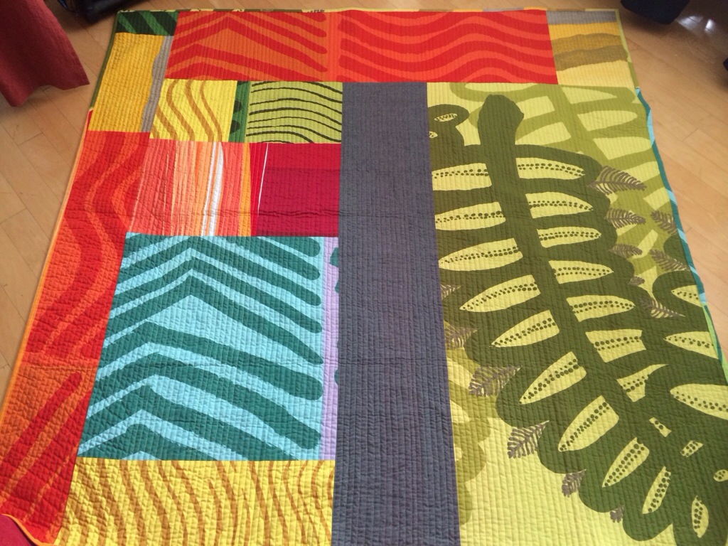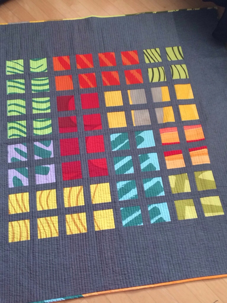 The back… I had a hard time figuring out what to use for the back. Nothing I had in my stash fit. So I did what I never do – I pieced the back, using the same fabrics I used in the top. Crazy, but I like it.