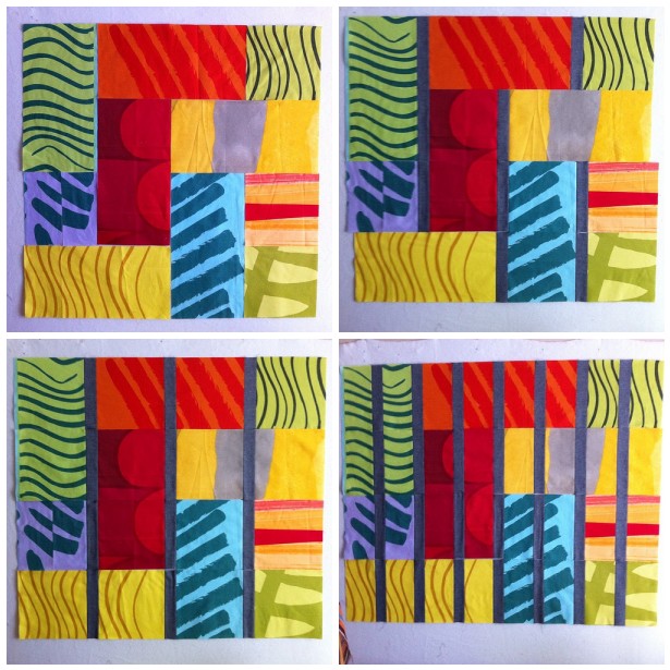 This is what the process looked like. I selected some fabrics I picked up at the Crate and Barrel outlet store (Marimekko), cut them up in panels, move them around the design board until I was happy with the colors, and then I started cutting and adding strips of the gray chambray. (You can see full sized pictures here)