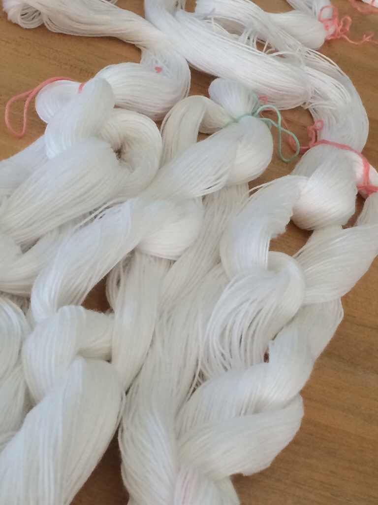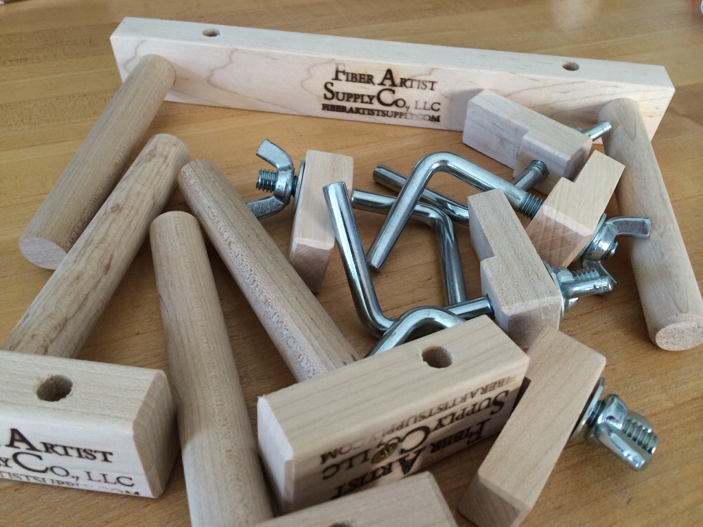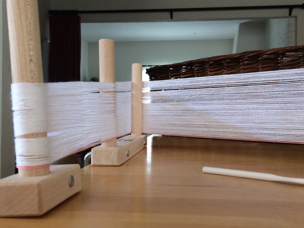 I don’t have room for a warp frame in our house, so I decided to buy these pegs you attach to your table, desk, bench, and they have been working for me so far. You can see them in the photo above and below. I bought them on easy’s theknitstore. They are well made, smooth and attach easily. The only problem is if surfaces you intend to use are thicker than 1 1/2 in, these pegs won’t fit.