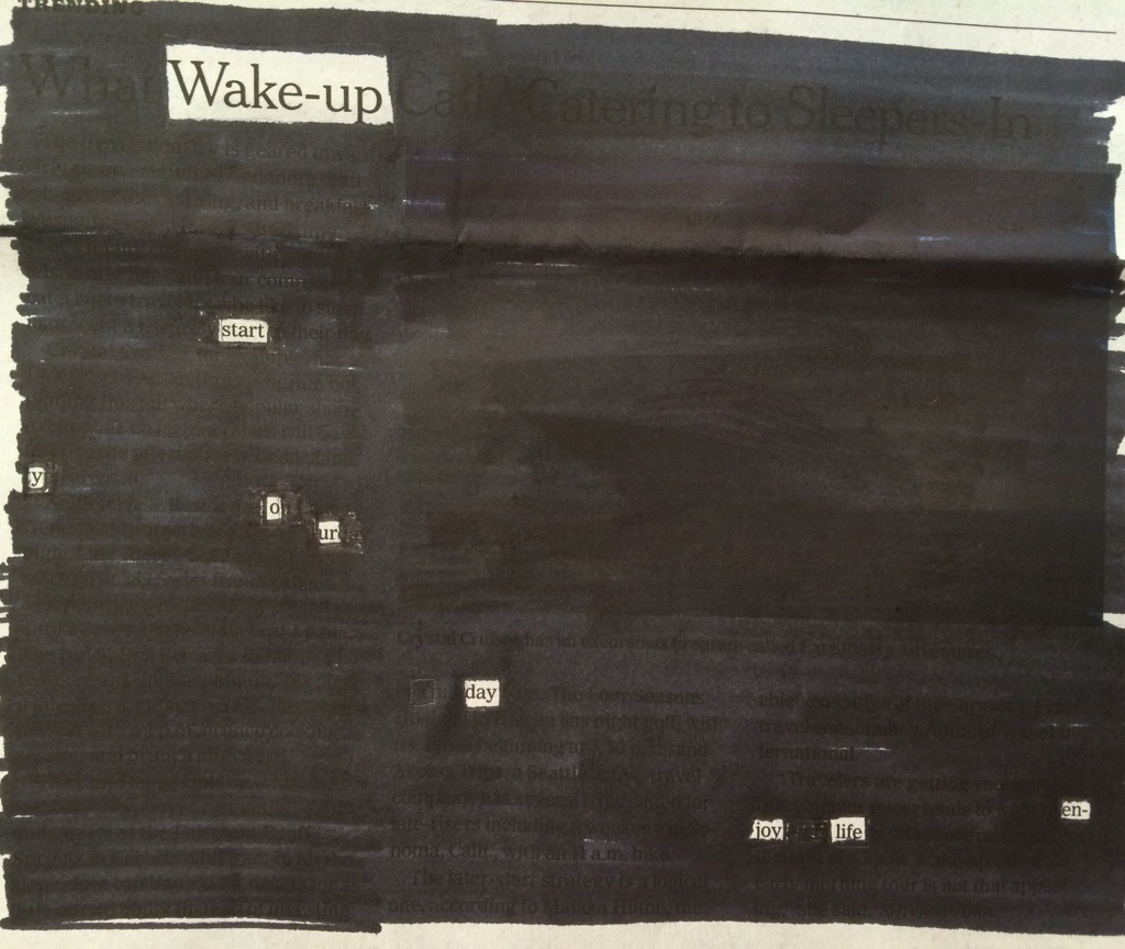 Blackout words #10 Posted on September 23, 2014September 24, 2014 by flekka Wake up Start your day Enjoy life Share this:Share Click to share on Facebook (Opens in new window) Facebook Click to share on Pinterest (Opens in new window) Pinterest Click to share on X (Opens in new window) X Click to share on Pocket (Opens in new window) Pocket Like Loading...
