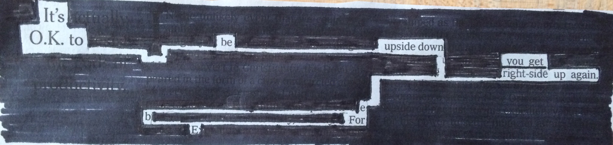 Blackout words #13 Posted on September 30, 2014September 30, 2014 by flekka It’s O.K. to be Upside down Before you get Right-side up again Share this:Share Click to share on Facebook (Opens in new window) Facebook Click to share on Pinterest (Opens in new window) Pinterest Click to share on X (Opens in new window) X Click to share on Pocket (Opens in new window) Pocket Like Loading...