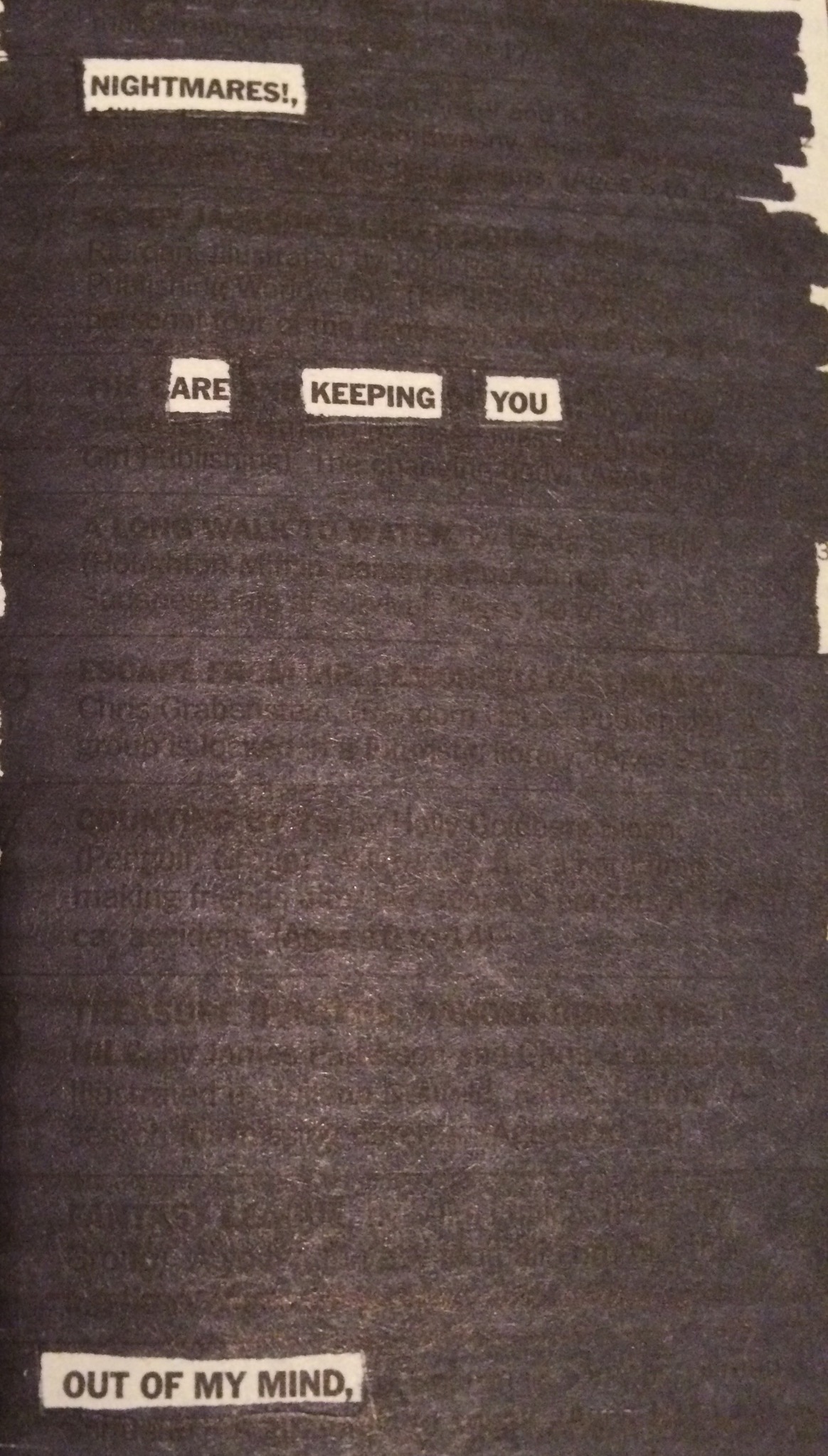 Blackout words #15 Posted on October 5, 2014October 5, 2014 by flekka Share this:Share Click to share on Facebook (Opens in new window) Facebook Click to share on Pinterest (Opens in new window) Pinterest Click to share on X (Opens in new window) X Click to share on Pocket (Opens in new window) Pocket Like Loading...