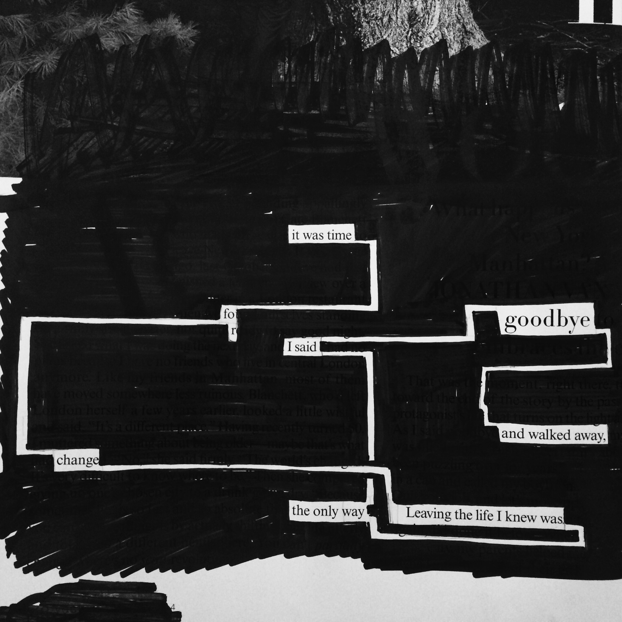 Blackout words #18 Posted on October 10, 2014October 10, 2014 by flekka It was time for change Leaving the life I knew was the only way I said goodbye And walked away Share this:Share Share on Facebook (Opens in new window) Facebook Share on Pinterest (Opens in new window) Pinterest Share on X (Opens in new window) X Like Loading...