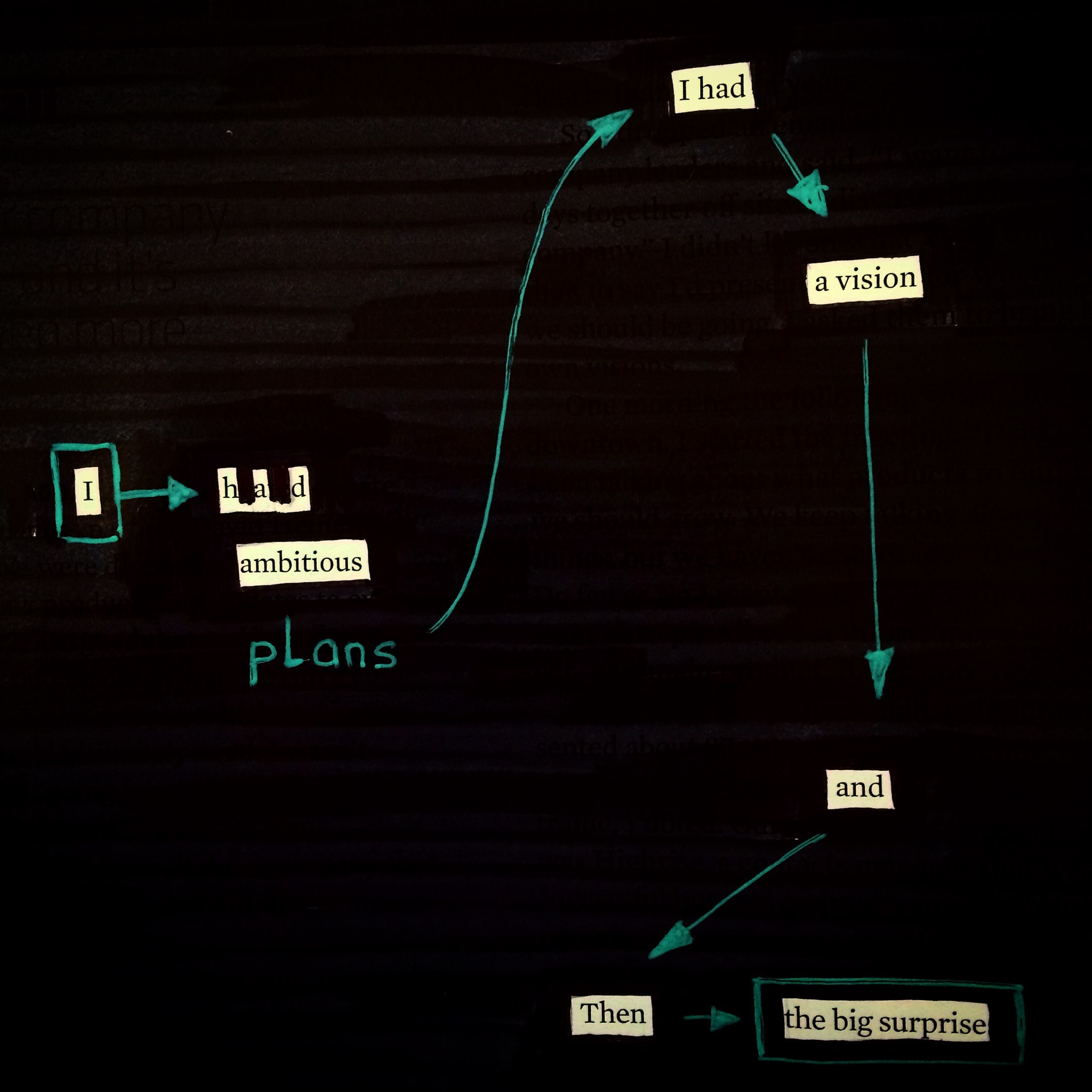 Blackout words #28 Posted on November 17, 2014November 17, 2014 by flekka I had ambitious plans I had a vision and then the big surprise Share this:Share Click to share on Facebook (Opens in new window) Facebook Click to share on Pinterest (Opens in new window) Pinterest Click to share on X (Opens in new window) X Click to share on Pocket (Opens in new window) Pocket Like Loading...